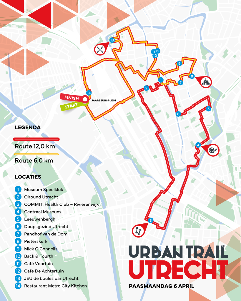 Voor de Urban Trail Utrecht op maandag 6 april 2026 op tweede paasdag wordt een supergaaf parcours ontwikkeld. Je kunt kiezen voor een korte route van ongeveer 5-6 km of een lange route van ongeveer 10-12 km. Vanaf de start ontdek je de binnenstad vol gezellige straten, pleinen, historische gebouwen en andere bezienswaardigheden. Binnenkort maken we de parcourskaart en alle deelnemende locaties bekend.